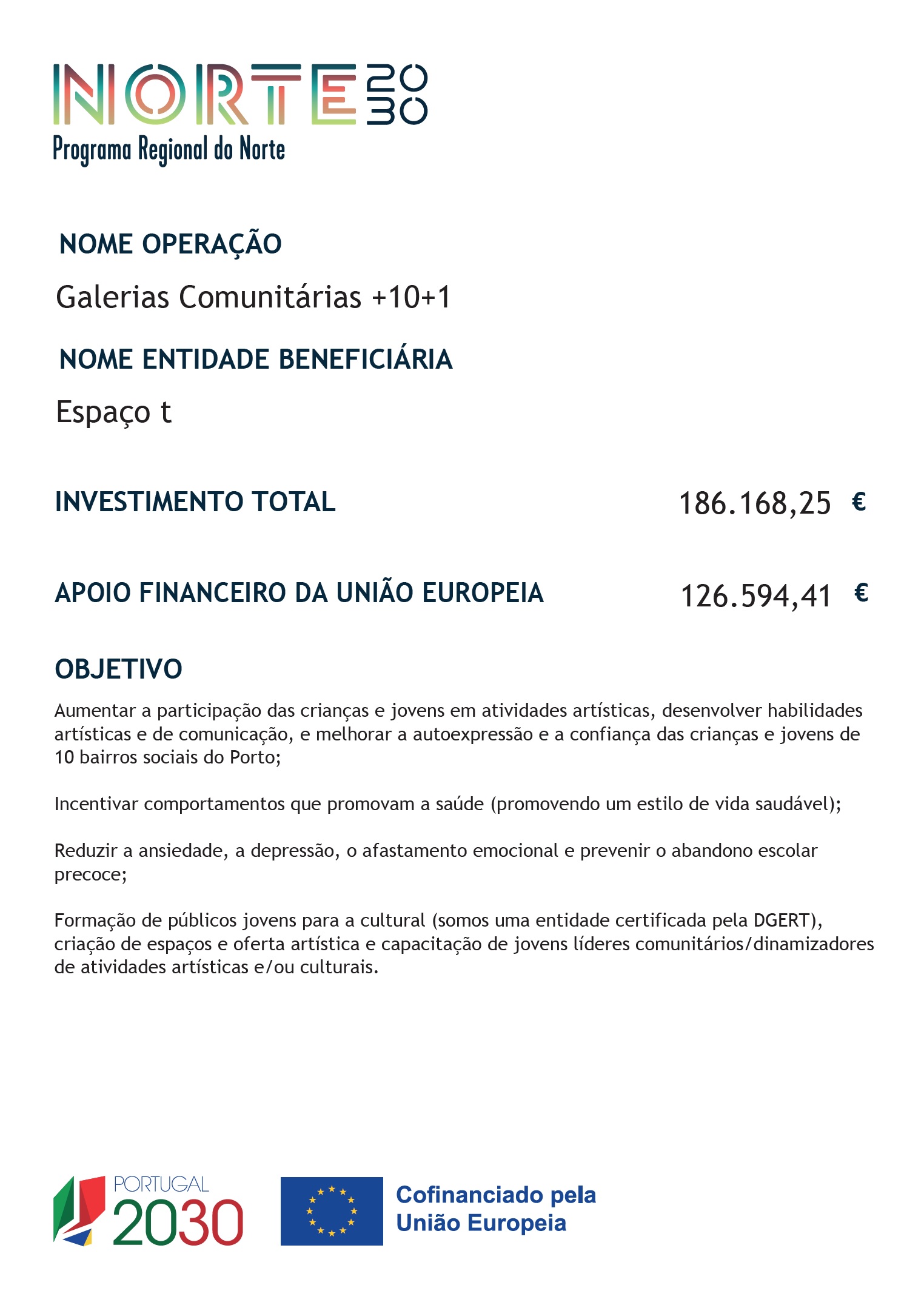 O projeto "Galerias Comunitárias +10+1", tem como investidor social a Domus Social, empresa Municipal da Câmara do Porto, sendo o restante financiamento assegurado pelo Programa Operacional Regional do Norte 2030, no âmbito do instrumento de financiamento gerido pela Portugal Inovação Social.